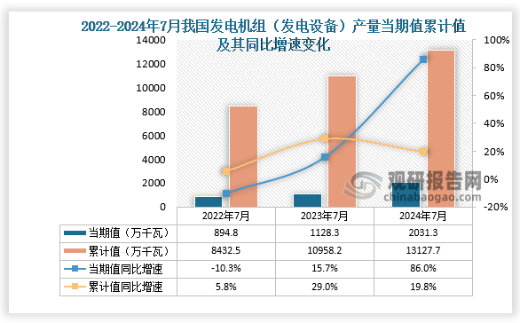 2024年1-7月我国发电机组(发电设备)产量约为131277万千瓦同比增长198%