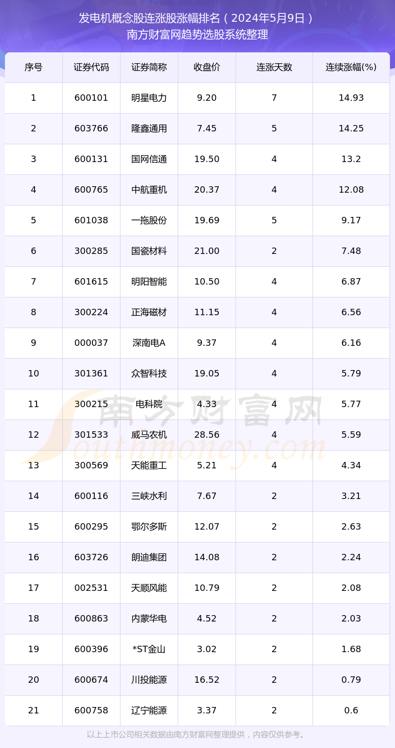 2024年5月9日发电机概念股连涨股都有哪些?